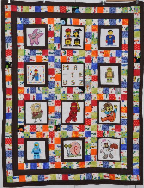 z taki motywami. Ewa misternie pozszywała małe kwadraciki i połączyła z kwadratami. Całość stanowi fantastyczną chłopięcą kołderkę.