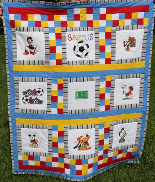 Chłopczyk bardzo lubi oglądać mecze piłki nożnej, więc ten motyw znalazł się na kołderce. Lubi też Myszkę