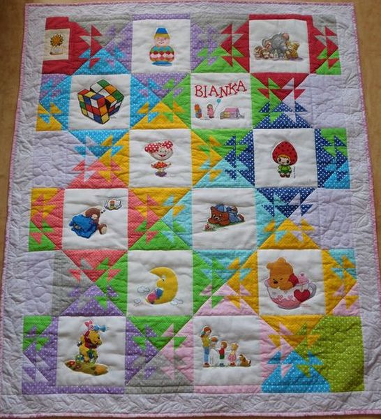 Na kołderce zagościły różne bajkowe postaci. Renia misternie połączyła kolorowe