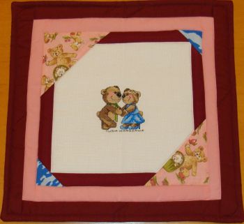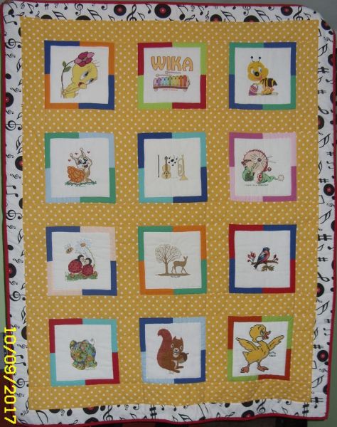 więc Cioteczki wyszyły instrumenty muzyczne. Wika lubi też zwierzątka i one również zgościły na kołderce. Nusia oprawiła kwadraciki w kolorowe ramki, uzupełniła materiałem