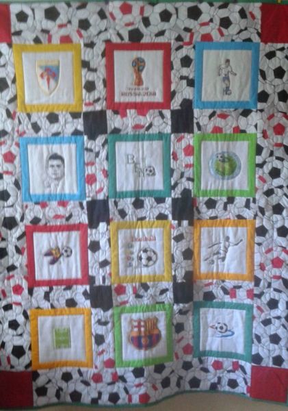 lubi piłkę nożną. Cioteczki wyhaftowały piłkarskie kwadraty, a Agnieszka oprawiła