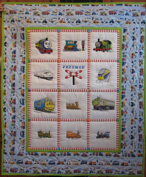 miłośnikiem kolei. Kołderkowe Cioteczki wyhaftowały kwadraciki o tej tematyce
