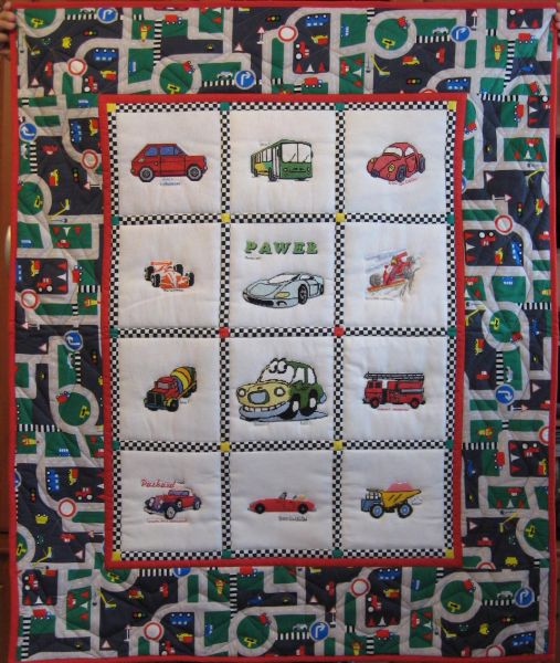 miłośnikiem motoryzacji. Kołderkowe Cioteczki wyhaftowały kwadraciki o tej