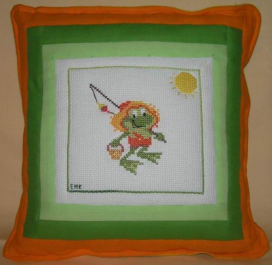 otrzymał poduszeczkę uszytą na kursie w Warszawie przez Elfix z kwadracika podpisanego EMK