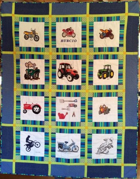 Kołderka pełna jest traktorów i motycykli, które pasjonują chłopca.