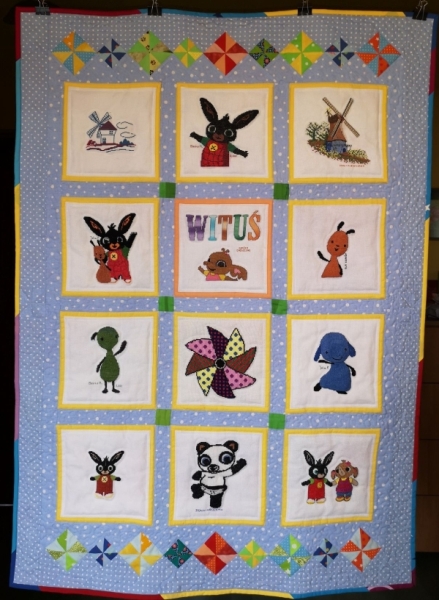 lubi Binga i wiatraczki i to one znalazły się na kołderce.