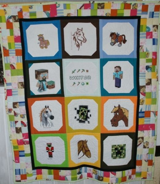Chłopiec bardzo lubi konie i grać w Minecraft i to te kwadraty znalazły się na kołderce.