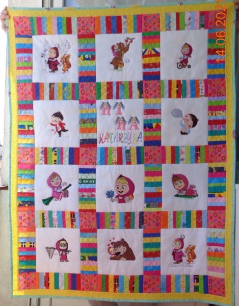 Dziewczynka bardzo lubi bajkę "Masza i Niedźwiedź" oraz przygody Pucia. Takie kwadraty znalazły się na kołderce, a Grażka oprawiła je cukierkowo.