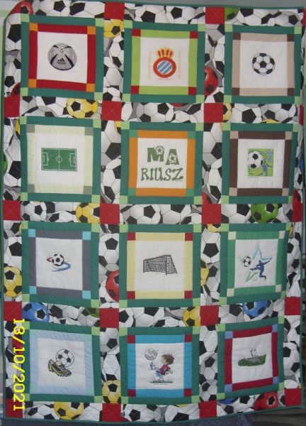 Chłopiec bardzo lubi piłkę nożną, więc Kołderkowe Ciocie wyszyły takie kwadraty. Nusia uszyła wspaniały patchwork.
