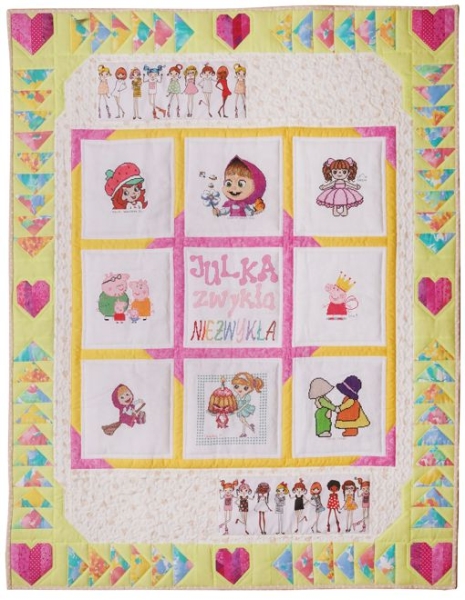 Misternie zszywała kwadraciki, uszyła serduszka i pięknie wypikowała kołderkę. Na kołderce znalazły się postacie z bajek, które lubi dziewczynka.