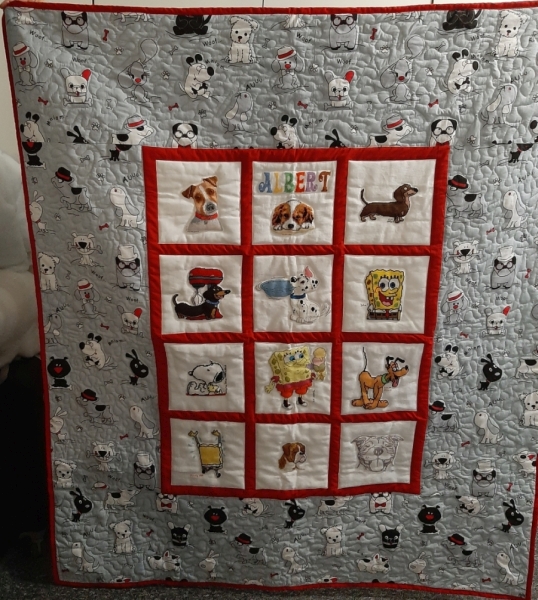 pełną piesków. Pikowanie uwypukliło pieski na kołderce.