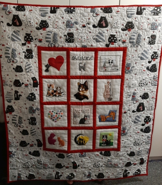 pełną kotków. Pikowanie uwypukliło kotki na kołderce.