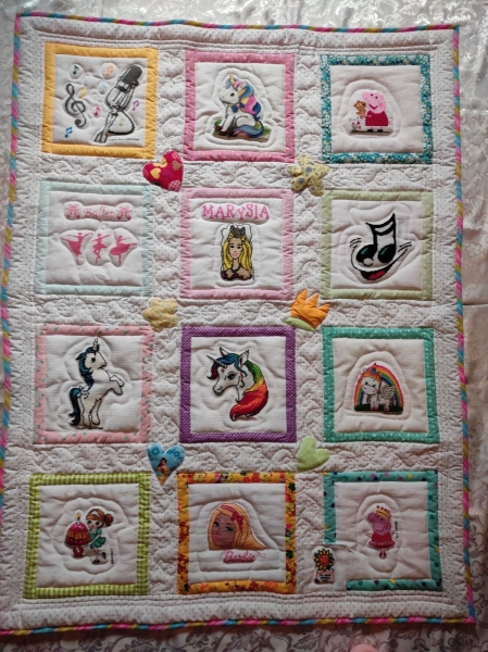 Na kołderce zagościły jednorożce i Barbie, które tak bardzo lubi dziewczynka.