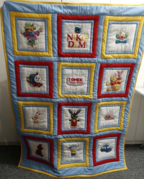 kołderka. Na niej zagościli bohaterowie bajek "Tomek i przyjaciele"