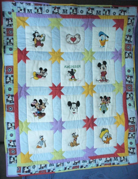 Chłopiec lubi Myszkę Miki i przyjaciół, więc te postacie znalazły się na kołderce. Bożena ozdobiła kołderkę kolorowymi gwiazdkami.