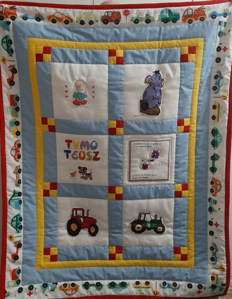 Tymka. Na kołderce znalazły się motywy dla małego chłopca.