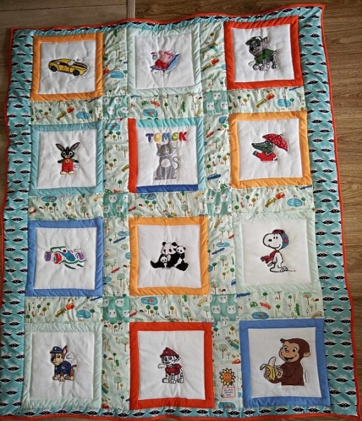Kołderka jest bardzo chłopięca i z pewnością bardzo spodobała się Tomkowi.