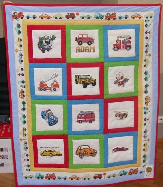 Kołderkowe ciocie wyhaftowały kwadraciki z przeróżnymi pojazdami i Super Zingsami.