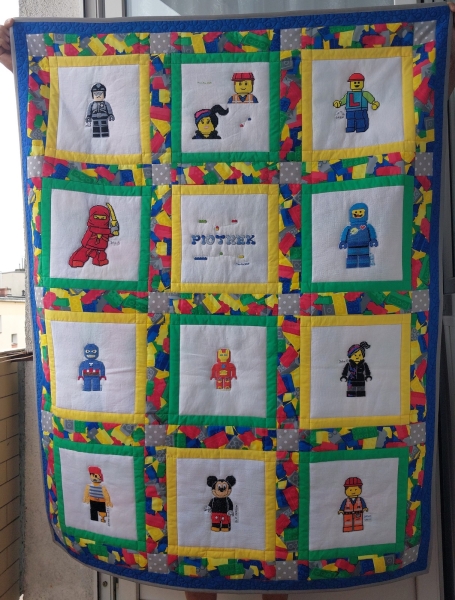 Zostały dla niego wyhaftowane kwadraciki z ludzikami lego.