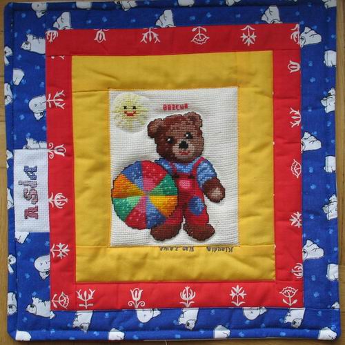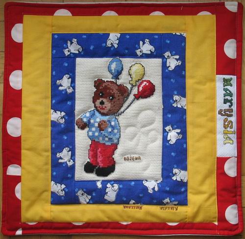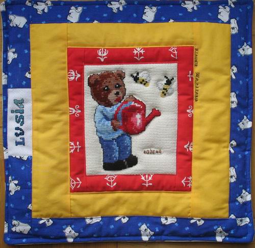 szyć z 3 kwadracików z misiowej serii wyszytej przez Bożenkę poduszeczki. Pomyślałyśmy