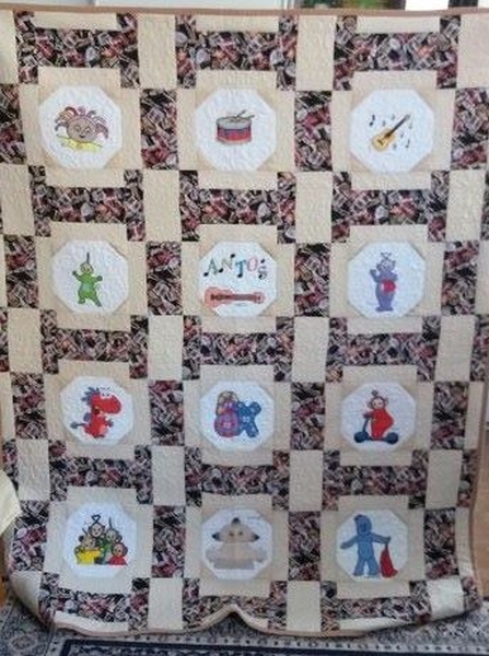 Ciocie wyhaftowały nie tylko muzyczne kwadraciki, ale i z postaciami z bajki Dobranocny Ogród i Teletubisie.