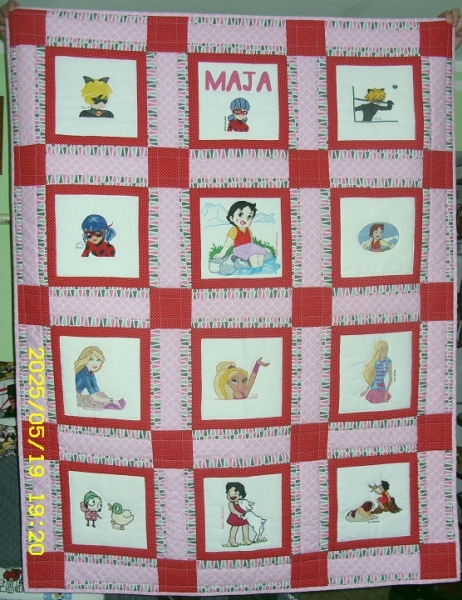 Heidi i Barbie. Takie właśnie hafty połączyła i pozszywała Nusia ze Śremu. Kołderka Mai jest fantastyczna, różowo-czerwona