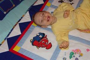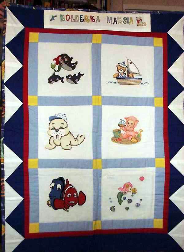 uroczymi, morskimi kwadracikami. Taka uszyta kołderka czeka sobie