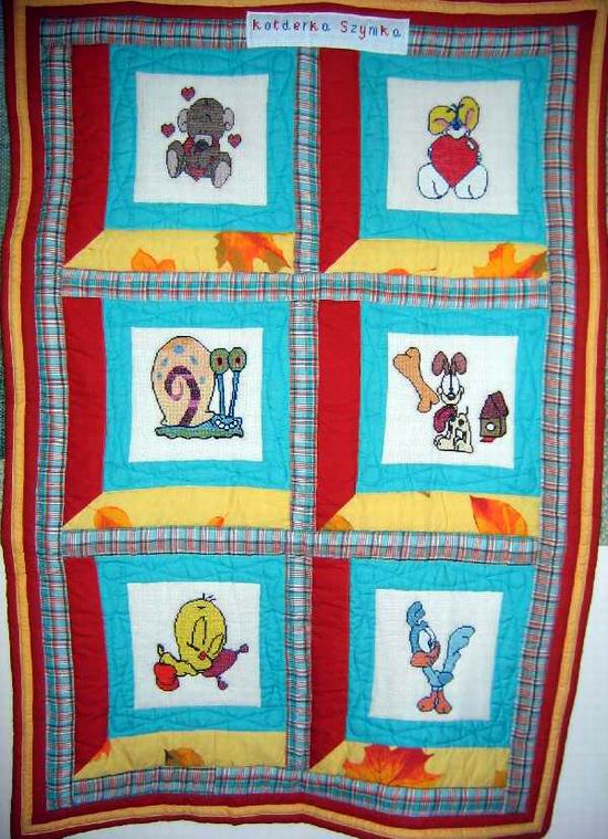 kwadraciki, które znalazły się na tej kołderce również wyhaftowała