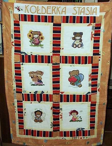Na kołderce znalazły się misiowe kwadraciki wyszyte przez: