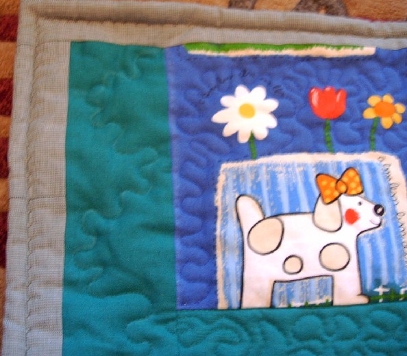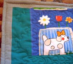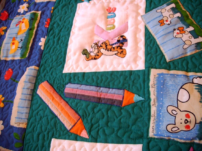 zielone tło kołderki. Kolorowe "rysiki" Renia wyhaftowała
