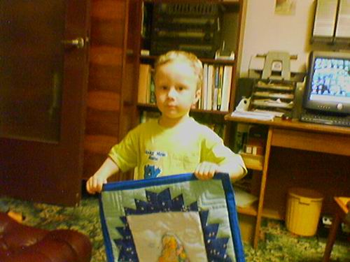 "Zgłosiłam się do szycia kołderki,ponieważ bardzo spodobał mi się "uśmiechowy" projekt. Dowiedziałam się o nim z "Wysokich obcasów" i w tym momencie byłam pewna, że muszę dołączyć do grona kołderkowych cioć. Parę lat temu zaraziłam się patchworkowym wirusem i maszyna do szycia stała się stałym elementem wystroju mojego mieszkania, a zszywanie "szmatek"jest tym,co mi sprawia wielką przyjemność. Kiedy dotarła do mnie przesyłka z kwadratami, zdałam sobie sprawę jak wielkim kredytem zaufania zostałam obdarzona. Na kołderce przeważa kolor niebieski, który jest ulubionym kolorem Justynki. O tym dowiedzałam się z bloga prowadzonego przez Nią. Zaglądam na niego regularnie. Justysia jest bardzo świetną,inteligentną dziewczynką. Często o niej myślę i mam