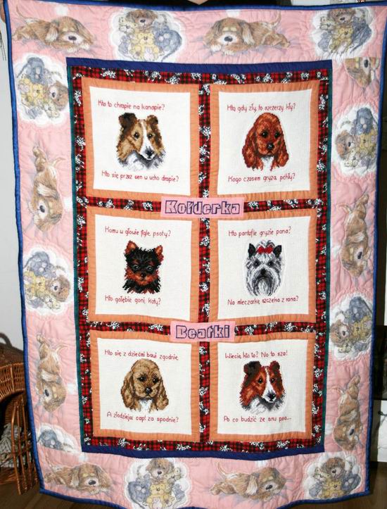 Na każdym kwadraciku oprócz obrazka z pieskiem wyszyta została