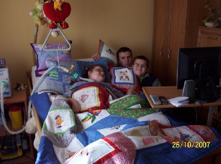 Poduszkę dla Jarosława, brata Sary - uszyła Justa z kwadracika wyszytego przez Nusie ze Śremu