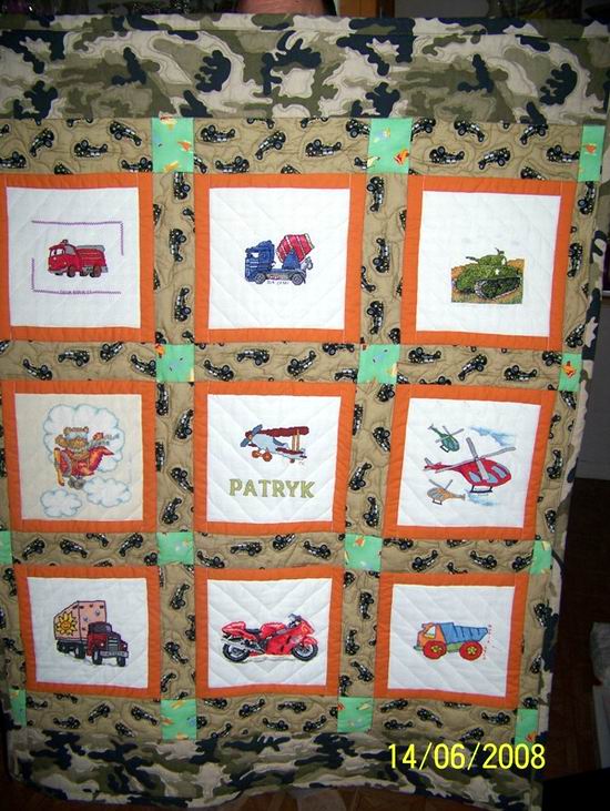 wojskiem. Kołderkowe ciocie wyszyły dla niego betoniarkę, różne