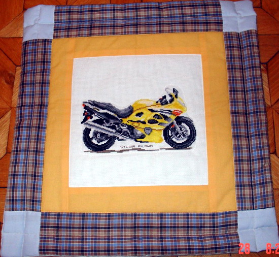 A brat Patryka - Kamil będzie mógł podziwiac wyhaftowany przez SYLWI@ motocykl na uszytej przez monia123 poduszce.