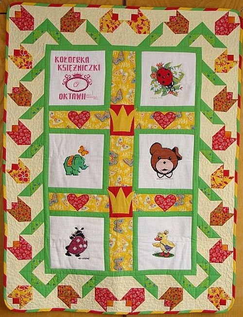 Kilkanaście tulipanów wszytych w kołderkę otacza wiankiem obrazki specjalnie wyhaftowane dla Oktawii.