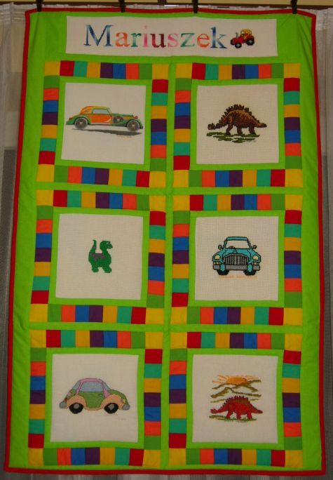 pojazdy, szczególnie traktory. I na szyldzie z imieniem została wyszyty właśnie traktor. Kołderka Mariuszka