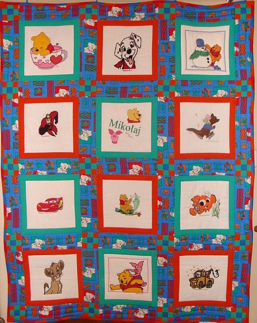 Szyciem zajęła się Grażka. Tematyka kwadracików jest różnorodna i dzięki temu powstała ciekawa kołderka.