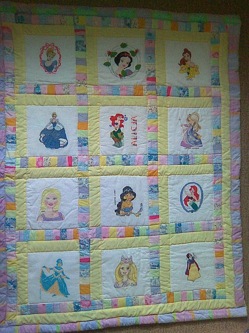 która wyczarowała przepiekną kompozycję z wąskich tęczowych paseczków. Na kołderce pojawiły się księżniczki i królewny z bajek,