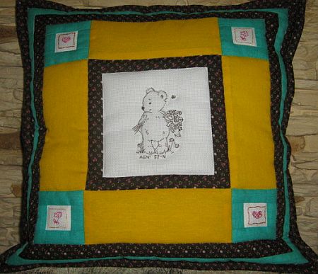 Agni Sz-n poduszka, na której znajdował się wyhaftowany przez Agni sympatyczny miś.
