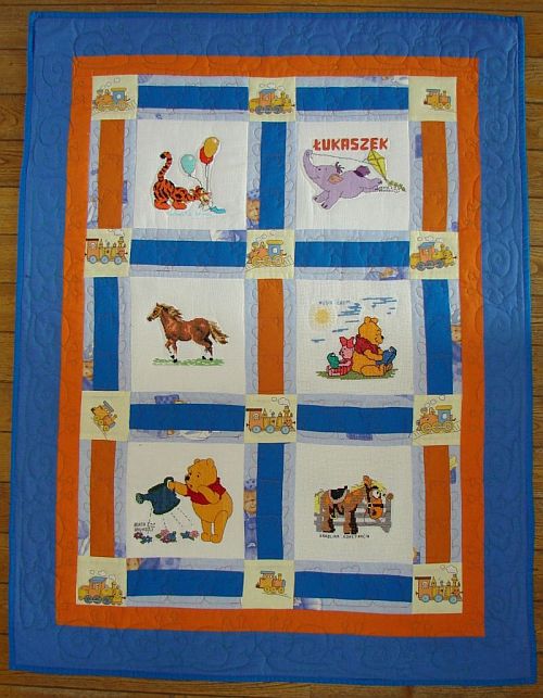 wykańczając ją dodatkowo naszytymi obrazkami z lokomotywami i pikowanymi ślimaczkami. Łukasz na pewno szybko zaprzyjaźni się mieszkańcami Stumilowego Lasu: