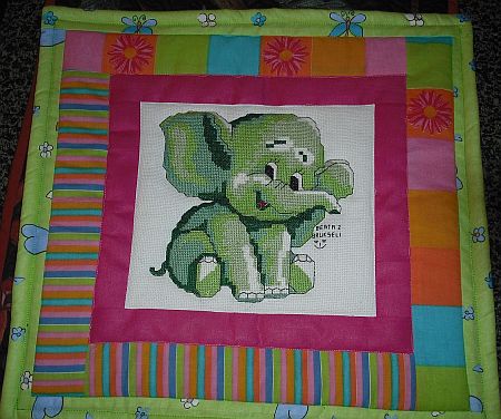 z zielonym słoniem wyhaftowanym przez Beatę z Brukseli.