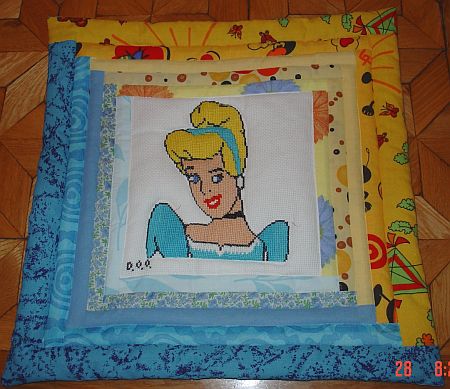 dodatkowo ozdobiła rogi oprawionych w ramki kwadracików naszytymi obrazeczkami z kotkami i pieskami.. Imię dohaftowano w Świętochłowicach .
