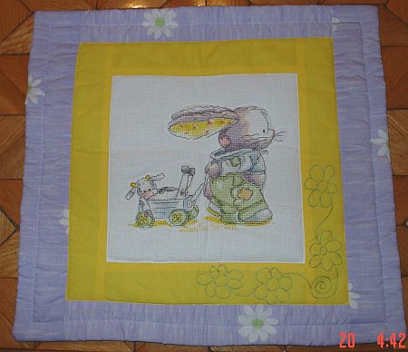 Dla starszej siostry Julki eBeata uszyła poduszkę z wyhaftowanym przez siebie króliczkiem.