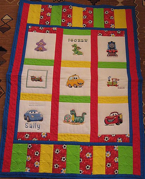 Kolorowe, żółte, czerwone i zielone "szmatki" nadają kołderce bardzo energetyczny charakter, a przepiękne pikowanki stanowią doskonałe wykończenie