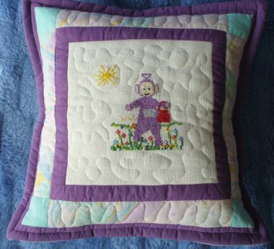 Raduś otrzymał poduszkę do przytulania uszytą przez enę z fioletowym Tubisiem