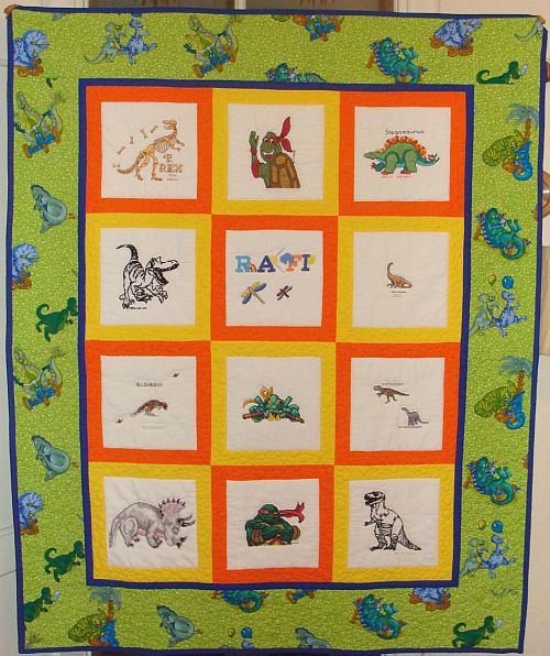 Cebulka (Ulka z Warszawy) uszyła dinozaurową kołderkę z energetycznymi, ciepłymi ramkami, w które oprawiła kwadraty