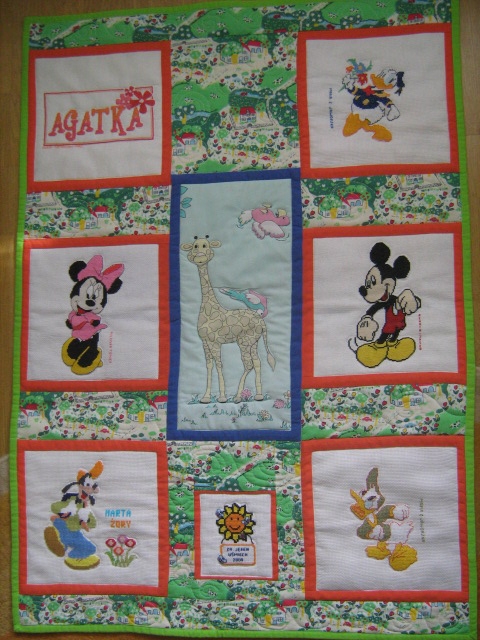 nieśmiały Mickey i wszędobylski pies Goofy. A na środku kołderki znalazła się urocza żyrafa z dłuuugą szyją. Jeszcze kolorowe tło oraz zakręcone pikowanki i