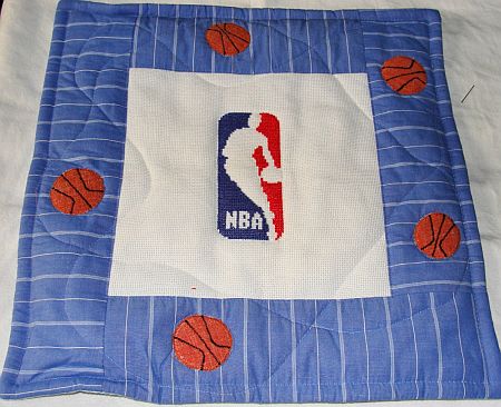 uszytą przez Zosię - Kocikową poduszką z wyhaftowanym przez Pierzastą logo NBA.