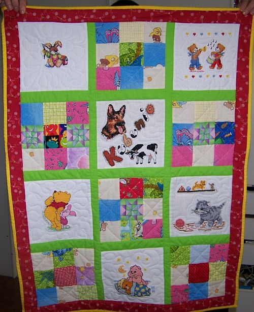 ozdabiając ją dodatkowo barwnymi kwadratami z przeróżnych tkanin. Na kołderce znalazły się także ulubione zwierzątka: Cezar i krówka.